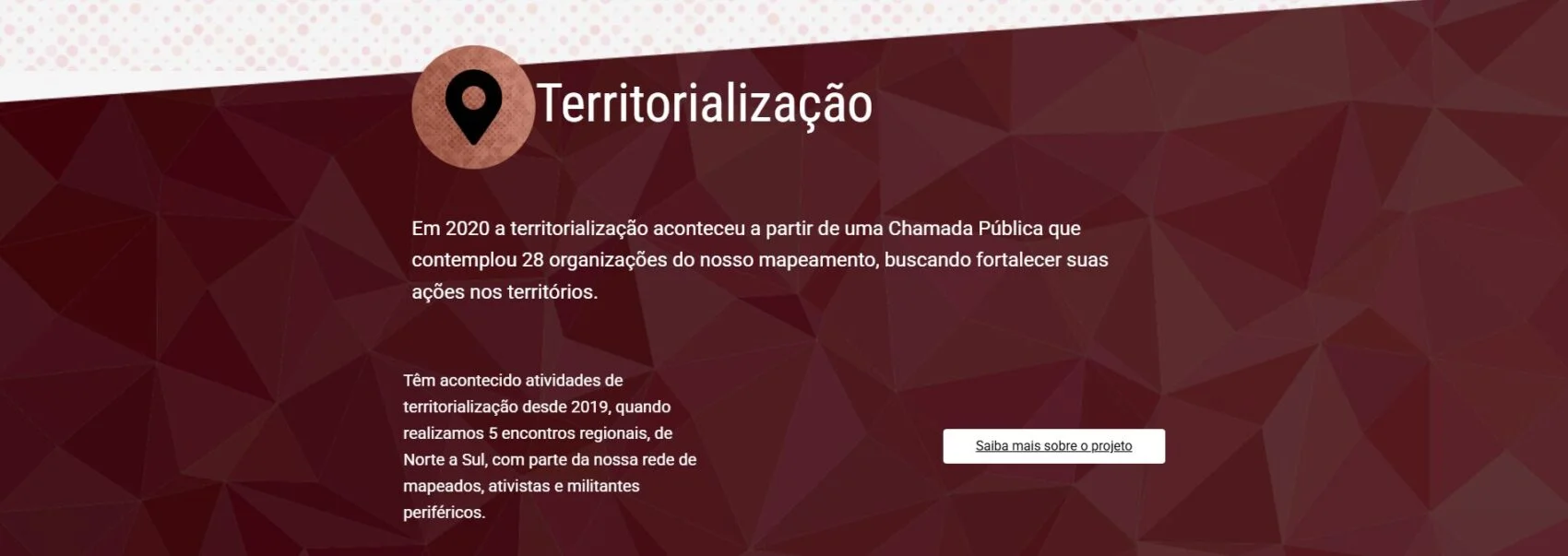 Hoje, o Projeto conta com três eixos temáticos, Cultura, Trabalho e Violência, e uma série de atividades que se dividem e se unificam em articulação, pesquisas e difusão. Criamos uma rede de pessoas e organizações em todo o Brasil, que estão nos territórios, nas universidades, terceiro setor, em governos e mandatos eleitos; temos pesquisas consolidadas, livros publicados; muitas conquistas e muitas a lutas a serem travadas.